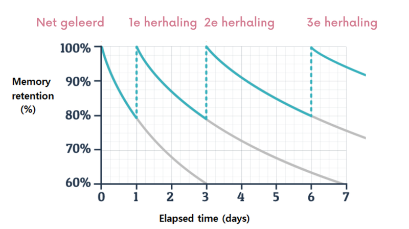 Geen paniek! Gelukkig hoeft dit niet het einde van je schoolcarrière te betekenen. Op de onderstaande curve zie je namelijk het positieve effect van herhaling. Wanneer je de leerstof regelmatig herhaalt, zal de leerstof veel langer in je geheugen blijven zitten! Dat kun je zien in bovenstaande figuur.