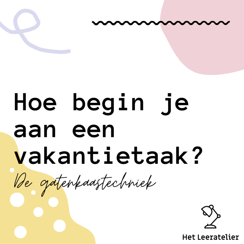 Bij de gatenkaastechniek stel je jezelf voor dat je gatenkaas maakt van je taken. Je boort gaten in je taak door er steeds een bepaalde periode aan te werken. Desnoods maar 5 of 10 minuten. Want zo’n taak maak je sowieso niet in één keer en de zomer is lang genoeg.